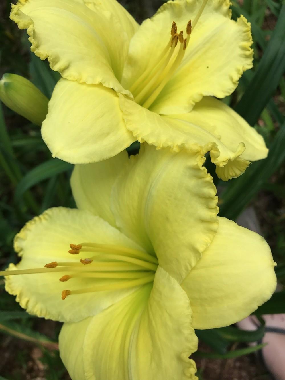 Clear pure soft yellow with a pleated and crimped gold edge. Nicely fragrant with quite fulsome flowers - this is no 'ordinary' Daylily and fully deserves appreciation.