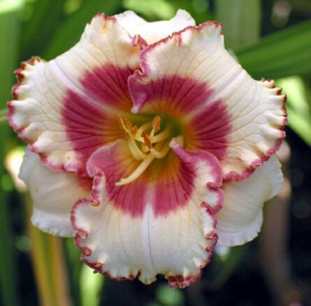 Very nice cream white with a feathered rose eye and crimped rose petal edge. Typically produces around 20 buds per scape once established and has a long bloom season. A very good Daylily.