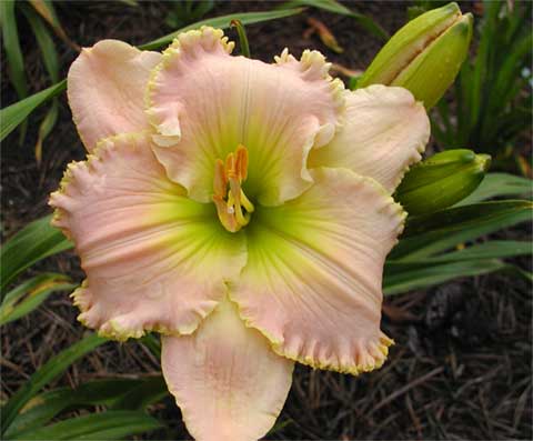 Belle Cook is a premier modern fulsomely formed and peerless soft pink self with a very firm texture and a wicked lime green throat. It is fragrant and very beguiling. the big fat buds [over 20 per scape] are supported on strong stems. There is a lovely gold crimped edge to each petal; peerless and a must-have for all lovers of Pink Daylilies.