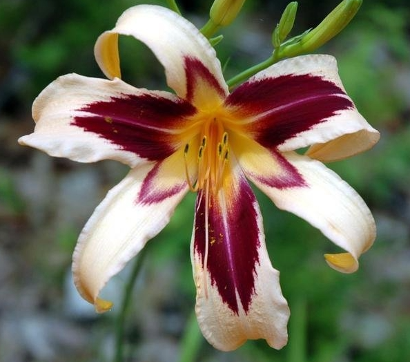 Ever since it was featured in a full page photo within Diana Grenfell's book on Daylilies some years ago this has been a revered and sought after Daylily but always scarce. Much used in breeding [it was even converted to a Tetraploid for the purpose] with many more modern and similarly patterned offspring yet perhaps the original has never been bettered for sheer beauty. The wine purple eyezone remains one of the most startling within the Spider class and is set on a soft melon pink background.