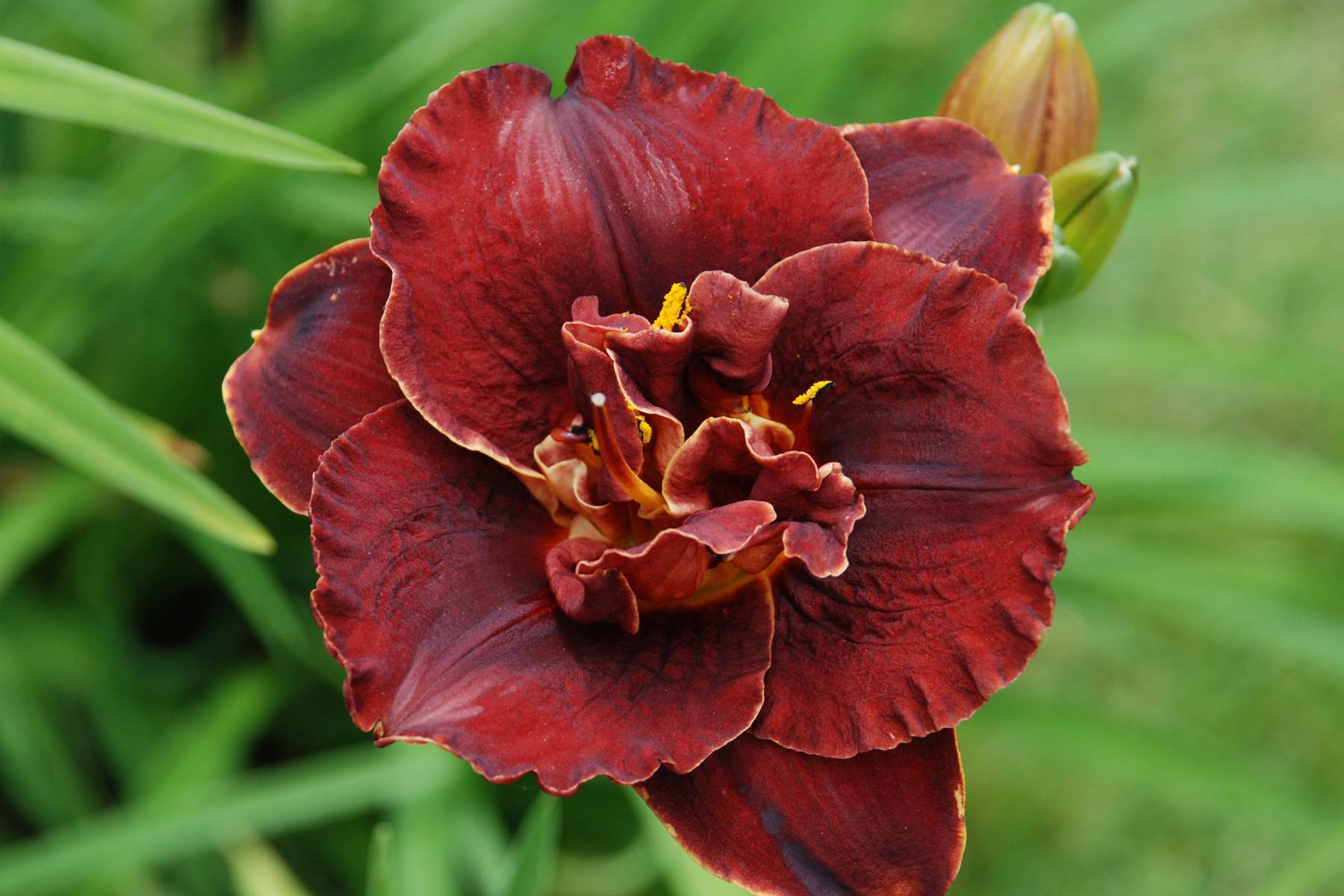 A crested double with crisp texture and decadent black-cherry red colouring, slightly darker in the centre of each fully formed flower. Not overly free-flowering here but perfect form and very majestic. Award winning double.