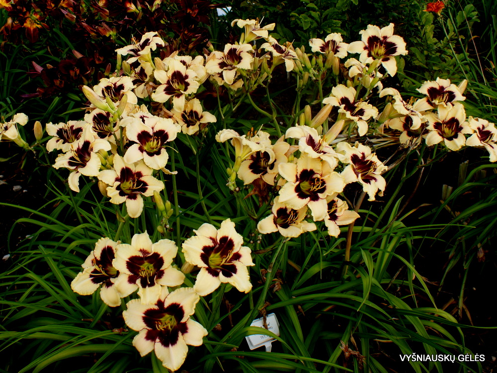 A particularly heavily blooming ivory cream with a plum purple eye. Individual fans are small and usually almost dormant here but provides a wonderful display nonetheless.