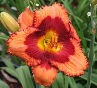 Has pop and pizzazz in abundance! Almost triangular blooms of burnt orange with a blood red eye and a narrow red petal edge.Often re-blooms with up to 31 buds per stem and 3 way branching. Impossible to ignore when blooming at clump strength and ideal in a border of hot colours or a standalone specimen planting.