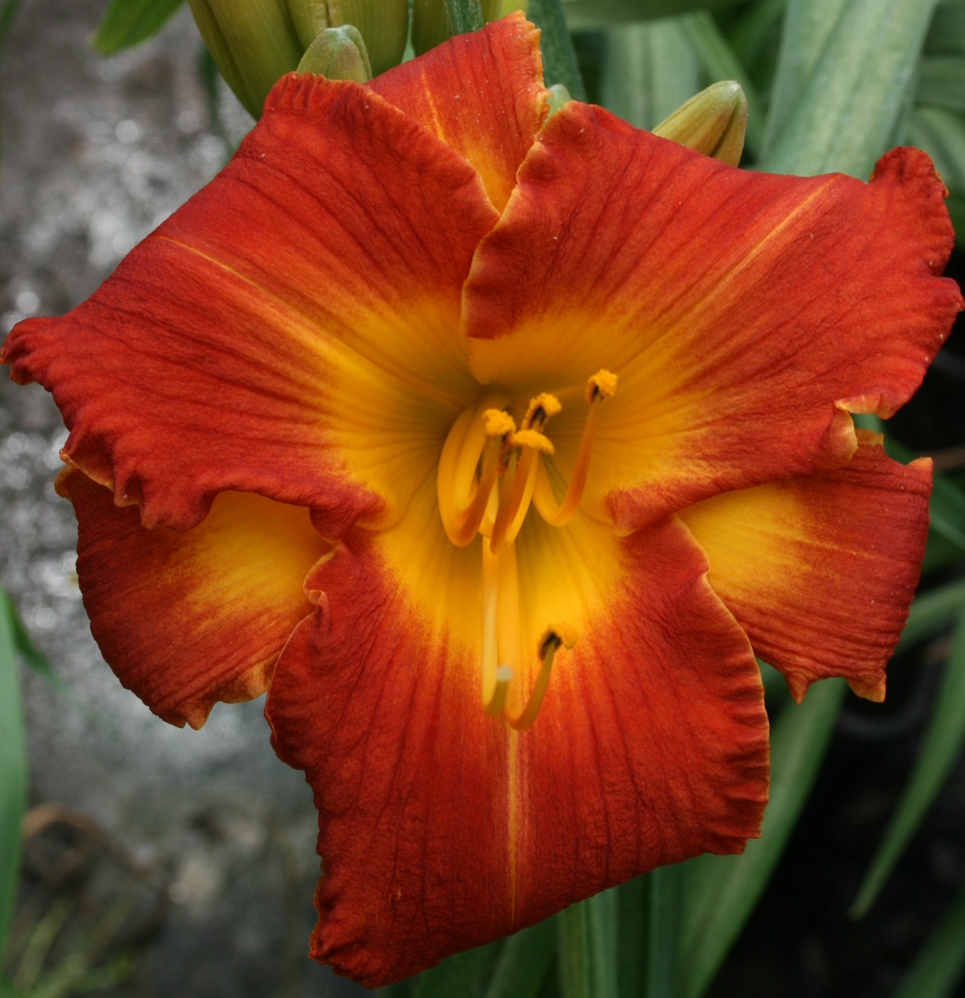 Adds a pop of colour to any garden area! A blend of fiery mandarin and firetruck red with a scintillating gold throat. Has very good form and gently reflexed petals. Seldom offered variety.